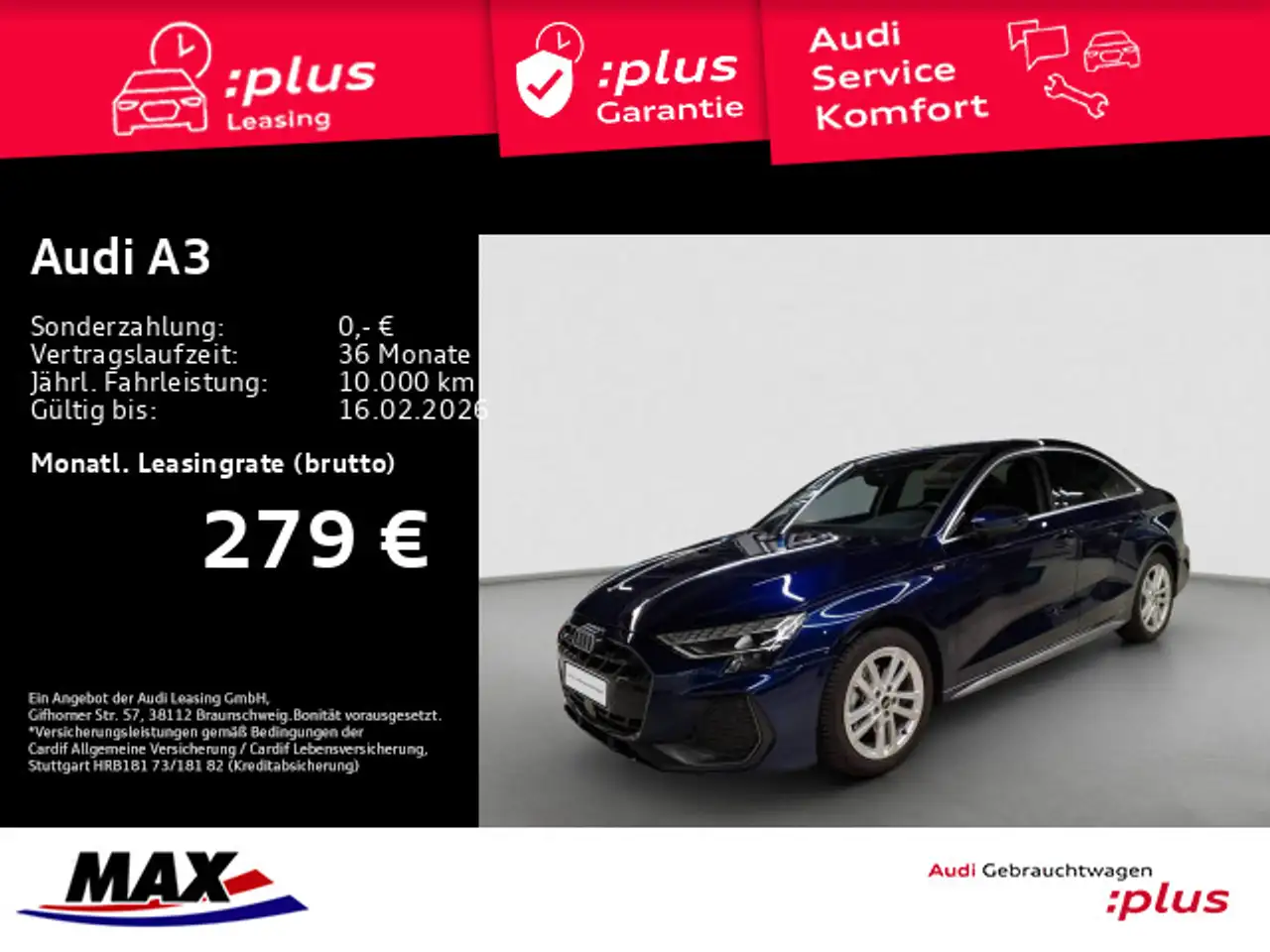 - Anbieterbank: Audi Bank - Zweigniederlassung der Volkswagen Bank GmbH / Gifhorner Str. 57 / 38112 Braunschweig