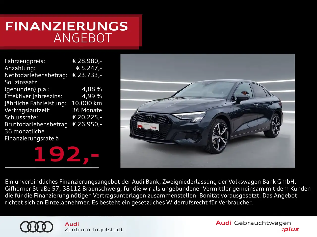 - Unter Raten verstehen wir den indikativen monatlichen Betrag bezogen auf das ausgeschriebene Finanzierungsbeispiel. Wir empfehlen dem Verbraucher, die Anzeige sorgfältig zu lesen. Der Verbraucher kann verschiedene Zahlungs- und/oder Finanzierungsformen bewerten, indem er den Werbetreibenden oder andere Finanzinstitute kontaktiert.