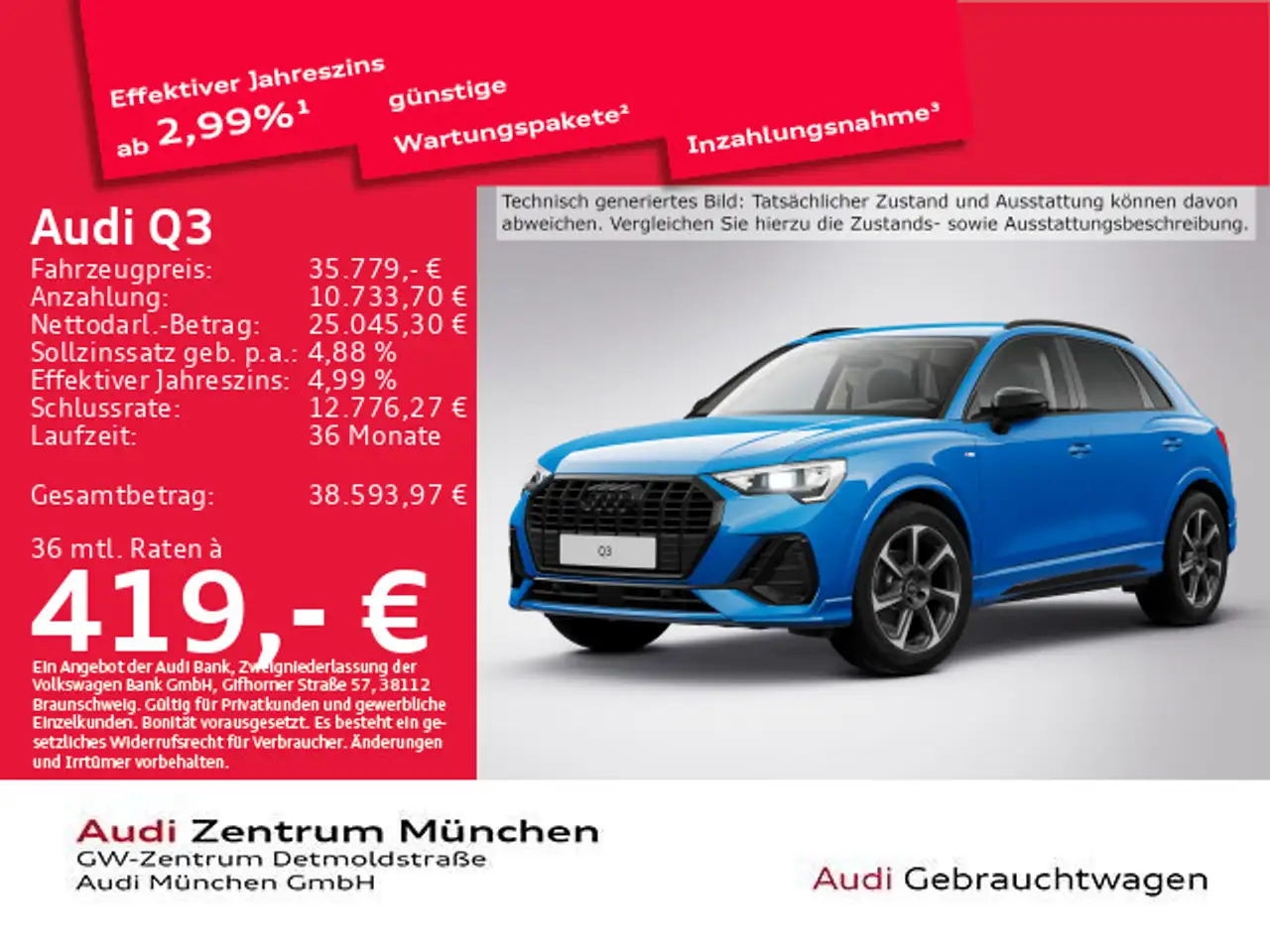 - Anbieterbank: Audi Bank - Zweigniederlassung der Volkswagen Bank GmbH / Gifhorner Str. 57 / 38112 Braunschweig