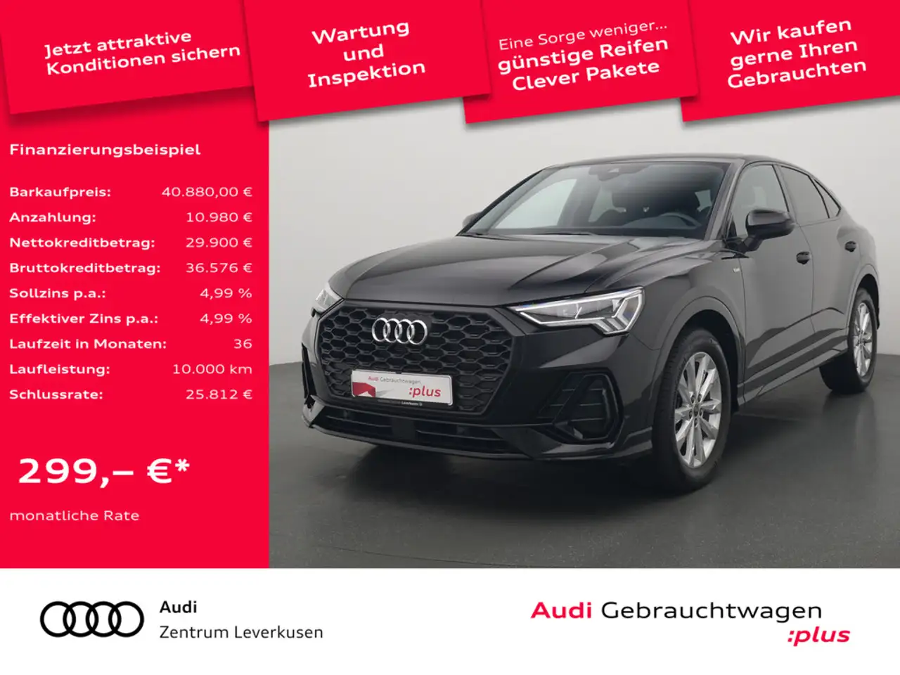 - (inkl. 19% MwSt.), 4,99 Prozent eff. Jahreszins bei 36 Monaten Laufzeit, einer Anzahlung von 10.980,00 EUR, einer jährlichen Laufleistung von 10.000 km und einer Schlussrate von 25.812,21 EUR. (Sollzins gebunden p.a. 4,99 Prozent, Gebühren 0,00 EUR, Kosten für Ratenabsicherung 0,00 EUR, Bruttokreditbetrag: 36.576,21 EUR, Nettokreditbetrag: 29.900,00 EUR)