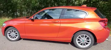 BMW 116i 3-türer Fließheck, 8-fach bereift, Navi, Freisprecheinrichtung, Glas-Schiebedach, 6-Gang Schaltgetriebe, Dachträgersystem, Fahrradtransporthilfe, Valencia Orange metallic, Innenausstattung: Stoff Anthrazit/Schwarz, Radio + HiFi-Lautsprechersystem, Nebelscheinwerfer, Regensensor, autom. Fahrlichtsteuerung, . VB 9.900€