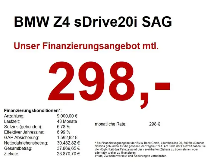 Weitere Informationen: Schlussrate 23.871 EUR, Laufzeit 48 Monate, Sollzins p.a. 6,78%, Sollzinsart gebunden, Nettodarlehensbetrag 30.482,82 EUR, Ratenabsicherung 1.592,82 EUR, Bearbeitungsgebühren 0,00 EUR, Anbieter BMW Bank GmbH, Heidemannstr. 164, 80939 München