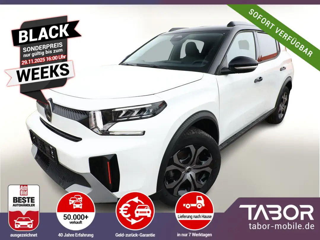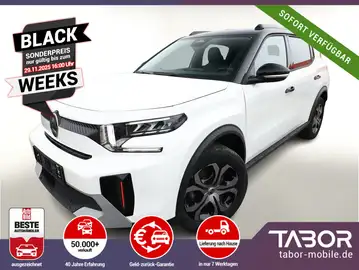 Dachfarbe Perla-Nera-Schwarz, Vorrüstung für Reserve-/Notrad, Antiblockiersystem (ABS), Audiosystem inkl. 10"-Touchscreen, 6 Lautsprecher, Fahrassistenz-System: Spurassistent (AFIL), Gepäckraumbeleuchtung, Gepäckraumboden höhenverstellbar, Geschwindigkeits-Regelanlage (Tempomat) inkl. Geschwindigkeits-Begrenzeranlage, Kartentaschen an den Vordersitzlehnen, Lenkrad mit Multifunktion, Leseleuchten vorn und hinten, Mittelarmlehne vorn, Navigation in Verbindung mit dem Smartphone (über Apple Carplay / Android Auto /…), Radioempfang digital (DAB), Reifen 215/60 R17, Schadstoffarm nach Abgasnorm Euro 6e (EU6 EA), Servolenkung, Smartphone-Schnittstelle (Apple CarPlay & Android Auto), USB-Schnittstelle (Typ C), Verzurrösen im Gepäckraum, Fahrassistenz-System: Automatische Fahrlichtschaltung inkl. Fernlichtassistent (Einschaltautomatik für Fahrlicht), Einparkhilfe hinten inkl. Rückfahrkamera (Rückfahrkamera), Außenausstattung: Farbclips in Rot, Außenspiegel mit Abdeckkappen schwarz, Citroen Advanced Comfort Sitze, Heckscheibe heizbar, Heckscheibenwischer, Karosserie: 5-türig, Lenksäule (Lenkrad) mech. höhen-/längsverstellbar, Mild-Hybrid 100 kW (Motor 1,2 Ltr. - 100 kW), Otto-Partikelfilter (GPF), Radstand 2670 mm, Sitz vorn links höhenverstellbar, Sitzbezug / Polsterung: Stoff, Stahlfelgen 7x17, Steckdose (12V-Anschluß) in Mittelkonsole vorn, Antriebsart: Frontantrieb, Getriebe Automatik - Doppelkupplungsgetriebe (6-Stufen, Hybrid), Klimaautomatik, Airbag Beifahrerseite abschaltbar, Airbag Fahrer-/Beifahrerseite, Kopf-Airbag-System und Seitenairbag, Fensterheber elektrisch hinten, Fensterheber elektrisch vorn, Isofix-Aufnahmen für Kindersitz an Rücksitz, Rücksitzlehne geteilt/klappbar 1/3-2/3, Seitenscheiben hinten und Heckscheibe dunkel getönt, Zentralverriegelung mit Fernbedienung, Head-up-Display, Dachreling schwarz, Außenspiegel elektr. verstell-, heiz- und anklappbar, Scheibenwischer mit Regensensor, Scheinwerfer Eco-LED, Reifendruck-Kontrollsystem