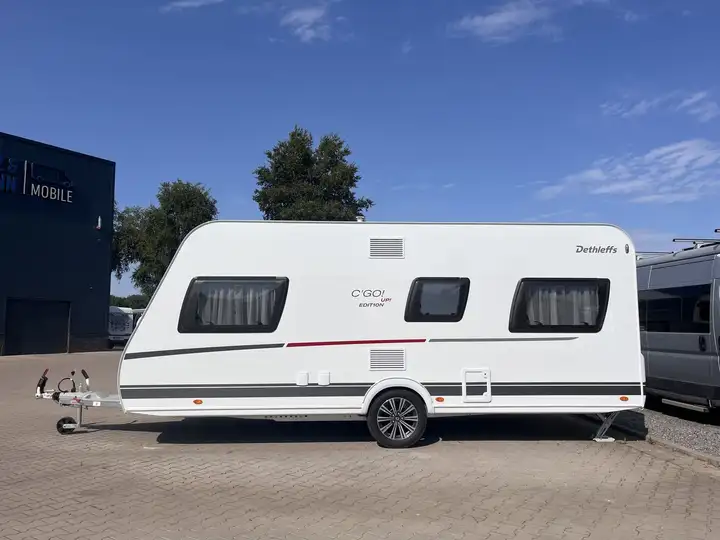 - Edition 10 Paket up 525 KR: Deichselabdeckung; 17" Alufelgen im Dethleffs-Design (Einachser); Stabilformstützen inkl. großflächige Abstützfüße; Warmwasserversorgung; Fliegengittertüre; Warmluftanlage; Dachhaube Heki II inkl. Baldachin beleuchtet; Indirekte Beleuchtung; Duschausstattung inkl. Duscharmatur und -vorhang; ATC Trailer Control; Außenblech in Glattblech weiß; Auflastung 1.800 kg (inkl. Stahlrad 195 R14 C LI106)