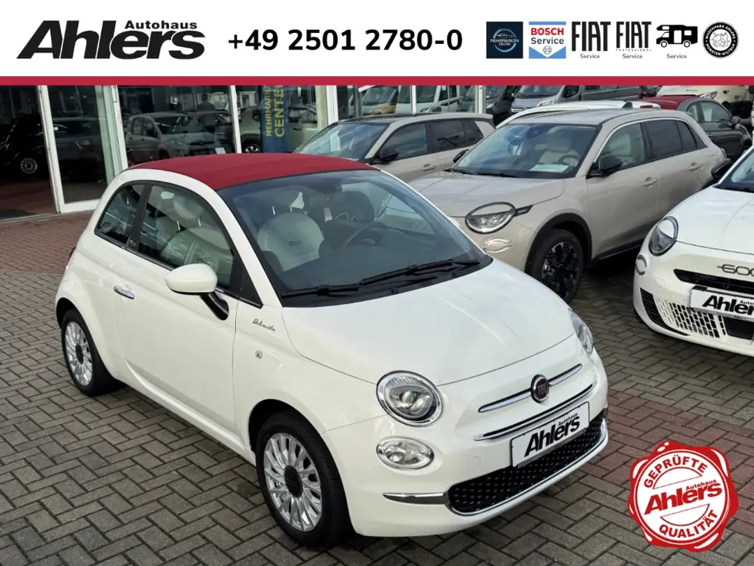Sehr schöner und gepflegter Fiat 500C DolceVita in Gelato weiß mit rotem Faltdach aus zweiter Hand (1. Hand Tageszulassung, 2. Hand Privat). Ausgestattet mit digitalem Tacho, Navigationssystem, Apple CarPlay / Android Auto, Ganzjahres- bzw. Allwetterreifen, Einparkhilfe hinten, Klimiaanlage, Tempomat, u.v.m.