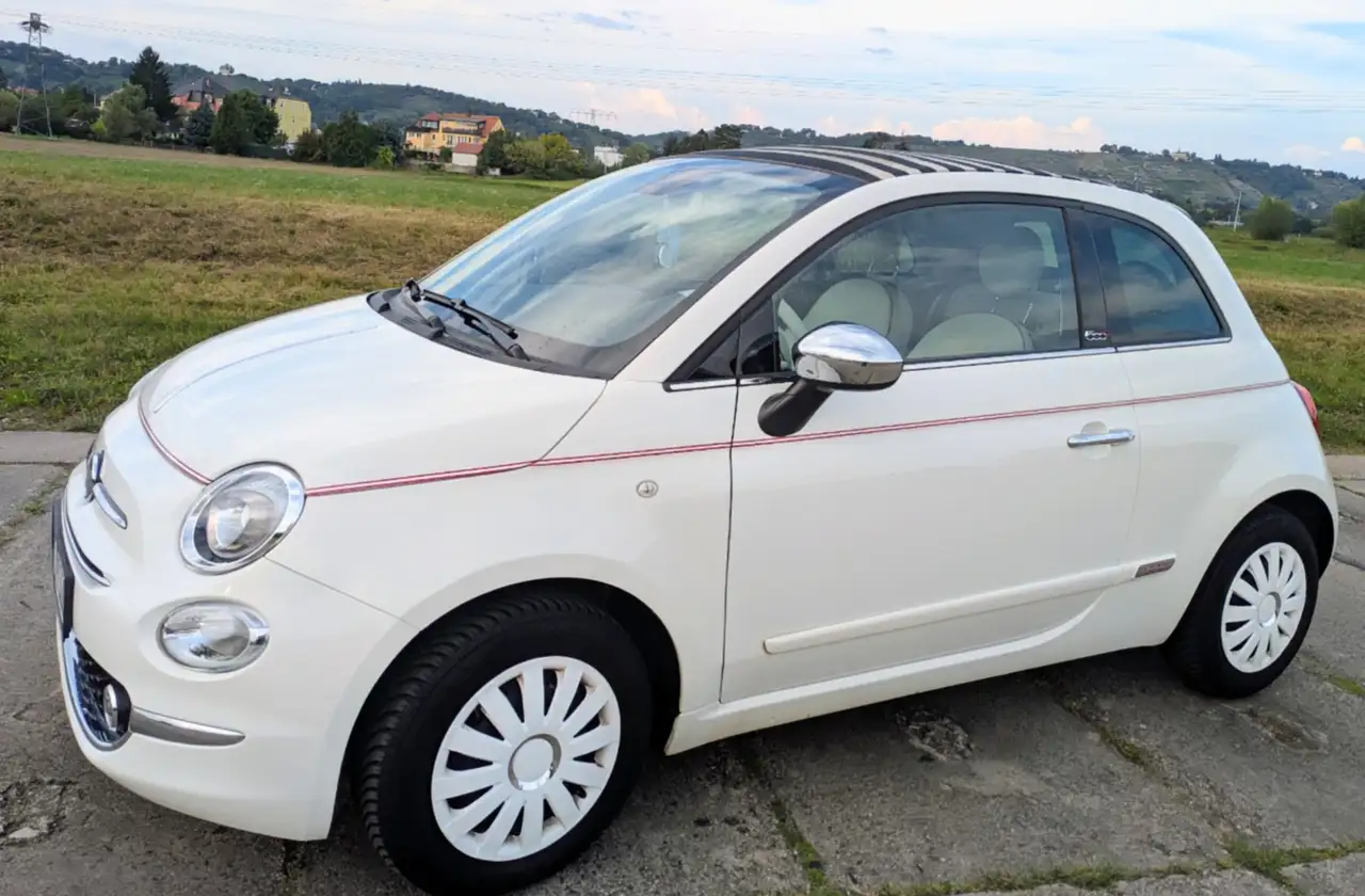 Das Fahrzeug ist in schillerndem Gelato Weiß lackiert, eine rot-weiß-rote so genannte Beautyline läuft rings um den gesamten Karosseriekörper. Ein Blickfänger ist auch der Chrom-Schriftzug Dolcevita auf der Kofferraumhaube, der perfekt harmoniert mit den in Chromoptik gefertigten Zierelementen auf der Motorhaube, den Abdeckkappen der Außenspiegel sowie den seitlichen Schutzleisten mit dem Logo 500. Der elegante Look wird abgerundet von weiß lackierten 16-Zoll-Leichtmetallrädern im Diamant-Finish.