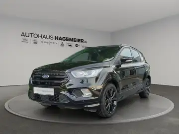 Paket: Ford Key Free-Paket - Ford Key Free-System (schlüsselfreies Ent-/Verriegeln) inkl. zweier passiver Fahrzeugschlüssel mit Fernbedienung - Heckklappe, sensorgesteuert (Öffnen per Fußbewegung), Bereifung: 8 J x 19 Leichtmetallräder (4) im 5-Speichen-Y-Design, schwarz mit Reifen 235/45 R 19, Dachspoiler, groß in Wagenfarbe lackiert, Lackierung: Metallic oder Mica, Paket: Winter - Frontscheibe und Scheibenwaschdüsen, beheizbar - Lenkrad, beheizbar - Scheinwerfer-Reinigungsanlage - Vordersitze, individuell und variabel beheizbar, Rückfahrkamera, Seitenscheiben ab 2. Sitzreihe und Heckscheibe, dunkel getönt, Navigationssystem Ford Navigationssystem, Außenspiegel elektrisch anklappbar und mit Umfeldbeleuchtung, Bereifung: Notrad anstelle Reifen-Reparatur-Set, 1 Satz Winterräder auf Ford Alufelgen, ABS inkl. EBD, Airbag (Seitenairbags) vorn, Airbag Fahrer- und Bei.seite""Full-Size"", Airbag, (Kopf-Schulterairbags) v. + h., Airbag: Knieairbag, Fahrerseite, Anhängevorrichtungs-Vorbereitungs-Set, Außenspiegel verstellb. u. beh.(2), Beifahrersitz mit Lendenwirbelstütze, Bereifung: Reifen-Repatur-Set, Berganfahrassistent, Body-Styling-Kit, Bordcomputer, Bremsleuchte, dritte, Colorglas, Dachkonsole mit Brillenablagefach, Dachreling,schwarz, Dachspoiler, Einpark-Assistent (Active Park Assist), Elektronisches Stabilitätsprogramm (ESP), Fahrersitz mit Lendenwirbelstütze, Fensterheber vorn und hinten, elektrisch, FordPower-Startfunktion, Fußmatten vorn und hinten, Velours, Fußraumbeleuchtung vorn, Gepäckraumabdeckung und -beleuchtung, Geschwindigkeitsregelanlage, Getriebe 6-Gang-Schaltung, Grundausstattung (Kuga), Heckscheibenwischer, Klimaanlage mit automatischer Temperat., Kopfstützen vorne und hinten (5) höhenv., Lederlenkrad mit roten Ziernähten, Lederschaltknauf, Lenksäule, in Höhe- und Reichweite einst, Leselampen LED vorn und hinten, Make-up Spiegel beleuchtet, Mittelarmlehne hinten mit Becherhalter, Mittelkonsole vorn mit Armauflage, MyKey-Schlüsselsystem, Nebelscheinwerfer, Paket: Sicht, Pedalerie mit Aluminium-Auflage, Pollen- und Staubfilter, Polster: Leder-Stoff in Wildleder-Optik, Reifendruckkontrollsystem, Rücksitzbank u.Lehne asym.get.umklappbar, Scheinwerfer, dunkel abgesetzt, Servolenkung, Sicherheits-Bremsassistent (EBA), Sitze: Beifahrersitz, manuell einstellba, Sportsitze vorn, Start-Stopp-System, Tagfahrlicht mit LED-Technologie, Wegfahrsperre, Zentralverriegelung m. Fernb.,