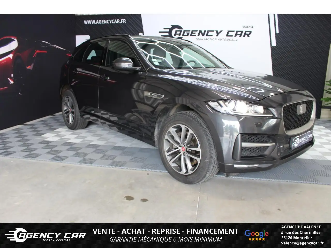 AGENCY CAR Showroom automobile à ValenceDepuis 2014, AGENCY CAR vous accompagne dans vos projets d'achat de véhicules d'occasion avec sérieux et transparence.Notre agence de Valence vous propose ce véhicule :JAGUAR F-PACE V6 R Sport, GRIS FONCE, 19 cv, 5 portes, première mise en circulation le 21-02-2017, garantie 6 mois.Véhicule visible UNIQUEMENT SUR RENDEZ-VOUS à l'agence de Valence (26).Horaires d'ouverture :Mardi au Vendredi : 10h - 12h / 13h - 18hSamedi : 10h - 15hFinancement possible de 12 à 72 moisGarantie jusqu'à 24 mois en optionLivraison dans toute la France (sur devis)Des erreurs peuvent se glisser dans nos annonces. Merci de nous contacter pour toute confirmation d'équipements ou d'informations.Vidéo 360° du véhicule disponible sur www.agencycar.frLes options : Black Pack - R-Sport, Caméra de recul, Climatisation automatique 4 zones avec ouïes de ventilation sur les piliers B et prise 12V additionnelle (suppression des ports USB en rang 2), Colonne de direction électrique, Crochet d'attelage détachable, Dynamique de conduite configurable en 3 modes, Ouverture et fermeture électrique du hayon, Pack Aide au Stationnement Avancé, Pack Aide au Stationnement Avancé avec Caméras, Pack InControl Touch Pro avec Meridian 380W, Pack Luxe, Peinture Métallisée Italian Racing Red, Radio Numérique DAB, Réglage éléctrique des lombaires en 4 directions, Réglage électrique des sièges Sport en 18x18 directions avec mémorisation conducteur, rétroviseurs et volant (si électrique), Rétroviseurs extérieurs chauffants, réglables et rabattables électriquement, à mémoire, à inversion Jour / Nuit automatique et avec lampes d'approche, Sièges avant chauffants, Système anti angles morts avec détection du trafic en marche arrière, Tapis de sol Premium, Volant chauffant, 2 Porte-gobelets sur la console centrale, Frais de dossier 690e, 4 vitres électriques à impulsion, Banquette arrière rabattable 40/20/40, Climatisation automatique bi-zone, Contrôle dynamique de la stabilité DSC, Détecteur d'obstacles arrière, Détecteur de pluie et allumage automatique des projecteurs, Détecteurs d'obstacles avant, Entourage des vitres latérales Gloss Black, Feux arrière partiellement à LED, Frein de parking électrique, InControl Touch - Système de navigation sur carte SD, écran tactile 8'', commandes vocales Jaguar Voice, Inserts de portières en finition Gloss Black, Jaguar Drive Control avec mode Eco, Normal, Dynamic et Hiver, Jantes 19'' Bionic - Grey, Kit carrosserie R-Sport, Palettes au volant, Prise 12V sur console centrale, rang 2 et coffre, 2 ports USB en rang 2, Prise auxiliaire USB sur la console centrale, Projecteurs antibrouillard, Rails de coffre, Réglage manuel des sièges en 8x8 directions, Régulateur de vitesse, Rétroviseurs extérieurs rabattables électriquement, chauffants et réglables électriquement avec lampes d'approche, Seuils de portes en métal avec inscription 'R-Sport', Sièges Sport en Cuir Taurus perforé, Système Bluetooth d'intégration du téléphone personnel avec fonction de streaming audio et compatibilité iPod, Tapis de sol, Technologie Stop/Start, Volant multifonctions en cuir pleine fleur avec touches chromées et badge 'R-Sport'