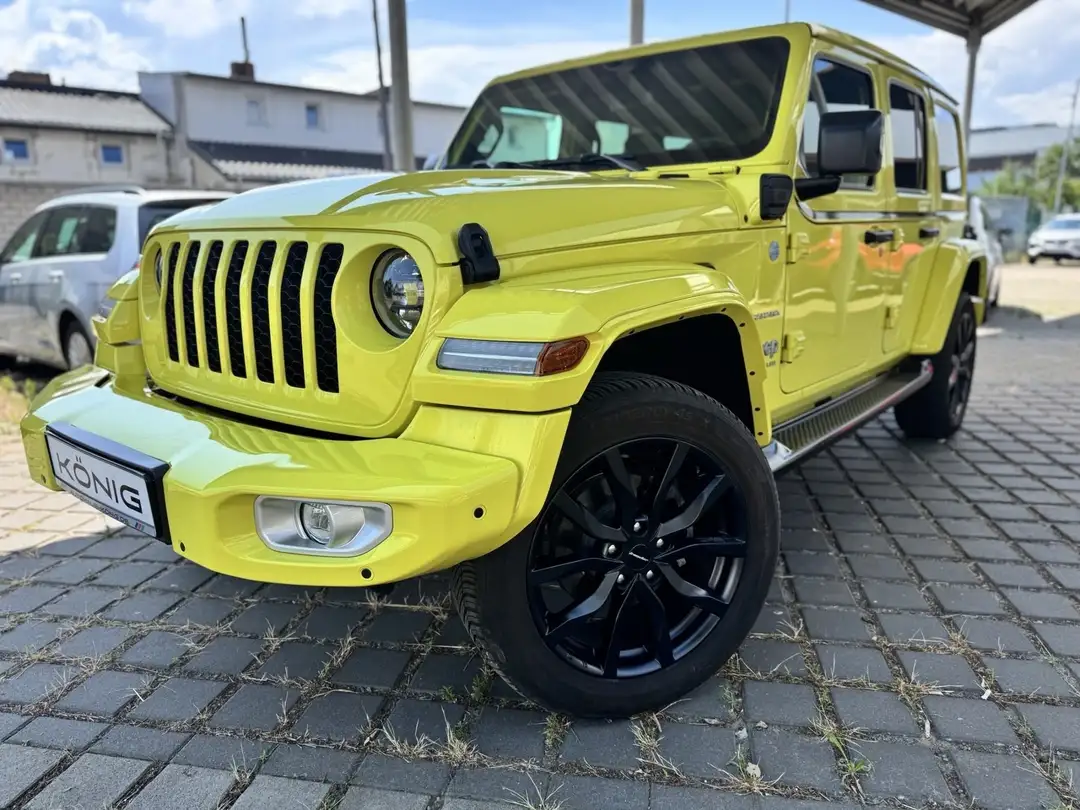 Voll-LED-Scheinwerfer, Aschenbecher (herausnehmbar) Zigarettenanzünder, Technologie-Paket, Seitenscheiben hinten und Heckscheibe abgedunkelt, SmartBeam Fernlichtassistent, Alarmanlage, Trittbretter seitlich, Telematik-Modul, Uconnect Services, ECALL, SCV, Sky One-Touch® Power Soft Top schwarz, Modelljahr 2023, Sicherheits-Paket, Sonder-Lackierung High Velocity, Sitzbezüge in Leder, Dachhimmel mit zusätzlicher Geräuschdämmung, Freedom® Hard Top in Wagenfarbe