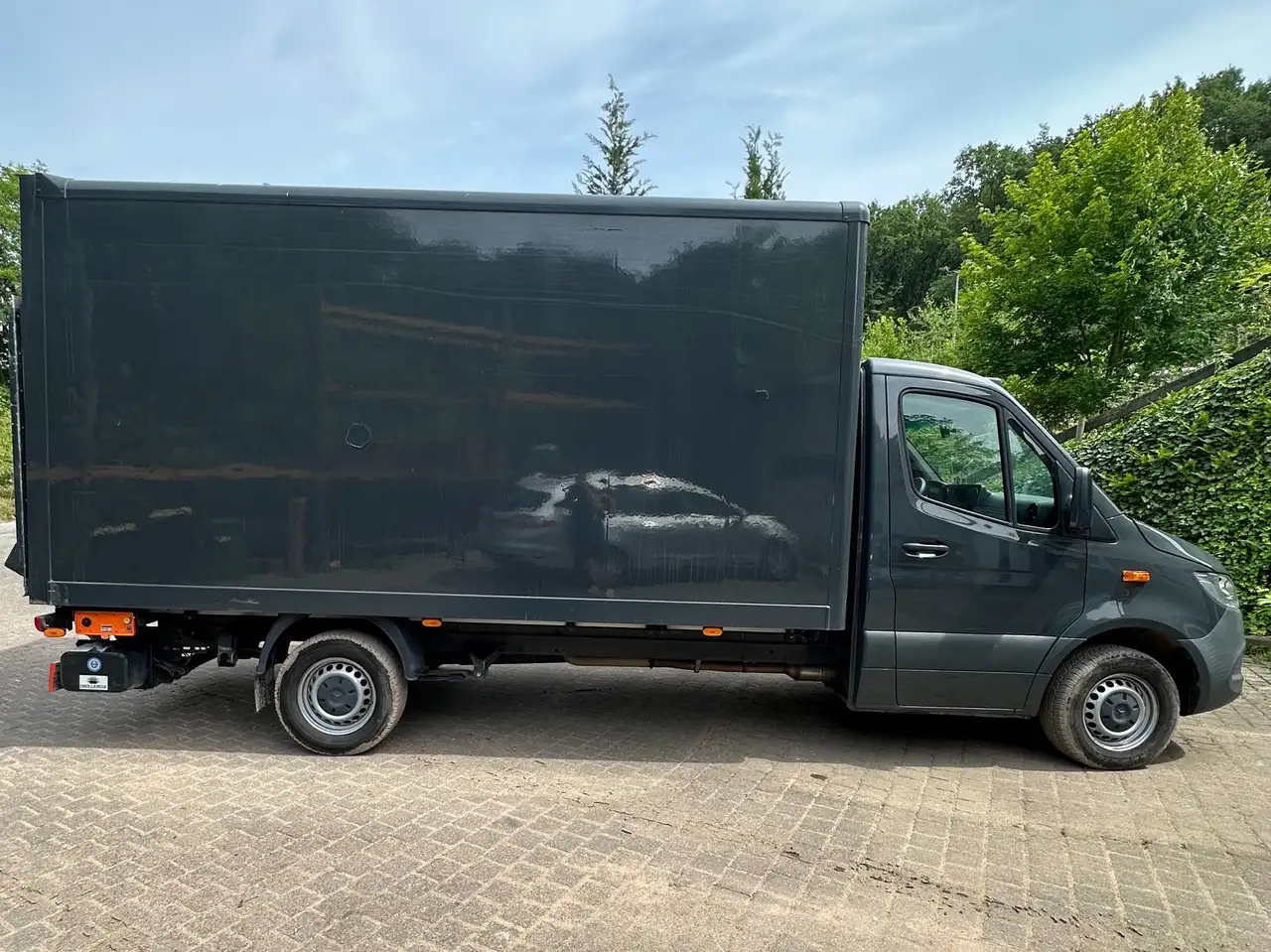 Der Mercedes Sprinter besitzt einen Kofferaufbau von DHollandia mit Hebebühne, diese kann seitlich am Fahrzeug betätigt werden, sowie auf der Hebebühne selbst.