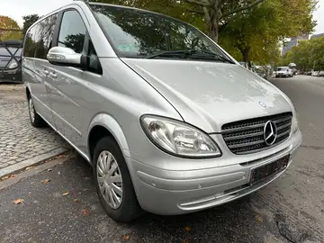 Airbag Beifahrerseite, Airbag Fahrerseite, Anzeige für Waschwasserstand, Ausführung: Viano, Außenspiegel elektr. verstell- und heizbar, beide, Außentemperaturanzeige, Bremsassistent, Cockpit Softtouch, Dachbedieneinheit mit Lesespot Fahrer-/Beifahrerseite, Deckenleuchte mit Lesespot Beifahrer, Design- und Ausstattungslinie Trend, Fenster für hintere Türen / Heckklappe mit Wisch-/Waschanlage, Fenster im Lade-/FG-Raum: - elektr. ausstellbar, hinten links/rechts, Generator 200 A, Getränkehalter hinten, Handschuhfach abschließbar, Heckklappe mit Verglasung, Karosserie/Aufbau: Bus, Karosserie/Aufbau: lang, Kindersicherung, Komfort-Kopfstützen Fahrgastraum, Lenkrad (Lenksäule mech. verstellbar), Mittelkonsole mit Staufach, Motor 2,1 Ltr. - 110 kW CDI KAT, Nebelschlussleuchte, PKW-Zulassung, Radstand 3200 mm, Radvollabdeckung, Reifen 205/65 R16C 103/101 T, Rückspiegel innen, Schadstoffarm nach Abgasnorm Euro 3 Gr. III, Sitzausstattung: Schnellverriegelung für Sitzschienen-System, Sitzbezug / Polsterung: Velours, Sitze im Fahrerhaus: Beifahrersitz Komfort, Sitze im Fahrerhaus: Fahrersitz Komfort, Sonnenblenden mit Spiegel (beleuchtet), Stahlfelgen 6,5x16, Steckdose (12V-Anschluß) im Lade-/Fahrgastraum, Stoßfänger / Stoßf.-Leiste seitlich + Griff an Heckklappe lackiert, Warmluftkanal zum Lade-/Fahrgastraum, Wartungsintervall-Anzeige Assyst