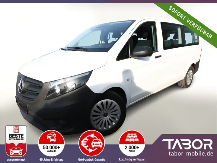 Klimaanlage geregelt (Tempmatik), Fahrassistenz-Paket (Fahrassistenz-System: aktiver Bremsassistent / Außenspiegel mit Totwinkel-Assistent / Fahrassistenz-System: Spurhalteassistent), Park-Paket (Rückfahrkamera / Parktronic-System (PTS)), Zusatzheizung (Warmwasser), Audio-Navigationssystem Audio 40 (DAB+, Bluetooth, USB), Anhängerkupplung: Kugelkopf abnehmbar, Klimaautomatik Fond (Tempmatik), Generator 250 A, Stahlfelgen 6,5x17, Fenster im Lade-/FG-Raum: - elektr. ausstellbar, hinten links/rechts, Lenkrad (Leder), Reserveradhalter unter Rahmenende inkl. Wagenheber, Sitze im Fahrerhaus: Fahrersitz Komfort, Radvollabdeckung, Anhängelast 2500 kg, Kraftstofftank: vergrößert, Komfort-Fahrwerk, Zweiwege Lautsprecher vorn und hinten, Raucher-Paket, DAB-Tuner (Radioempfang digital), Reifen 225/55 R17, BlueEfficiency-Paket (Start/Stop-Anlage Motor), Sicherheitsgurt-System mit Warnanlage (Fahrer-/Beifahrerseite) (Sicherheitsgurt-System mit Warnanlage (Beifahrerseite)), 3. Bremsleuchte, Adaptives Bremslicht, Anzeige für Waschwasserstand, Außenspiegel asphärisch, beide, Außentemperaturanzeige, Bodenbelag: Fahrgastraum TPO, Dachbedieneinheit mit Lesespot Fahrer-/Beifahrerseite, Dachverkleidung, Design- und Ausstattungslinie PRO, Einstiegsgriff hinten, Fahrassistenz-System: Pannenmanagement, Fenster für hintere Türen / Heckklappe mit Wisch-/Waschanlage, Fenster im Lade-/FG-Raum: - feststehend, vorn links, Fenster im Lade-/FG-Raum: - feststehend, vorn rechts, Frontscheibe mit Scheibenantenne, Geschwindigkeits-Begrenzeranlage 210 km/h, Getränkehalter vorn, Gurtstraffer, Haltegriffe A-Säulen, Haltegriffe im Fond, Handschuhfach abschließbar, Harnstofftank (AdBlue): 24 Ltr., Heckklappe mit Verglasung, Heckscheibe heizbar, Heckscheibenwischer, Innenverkleidung gehobene Ausführung, Karosserie/Aufbau: extra lang, Karosserie/Aufbau: Kombi Standard, Kindersicherung, Kombiinstrument mit Pixel-Matrix-Display, Lenkrad (Lenksäule mech. verstellbar), Modellpflege, Motor 2,0 Ltr. - 120 kW CDI KAT, Nebelschlussleuchte, PKW-Zulassung, Pro, Radstand 3430 mm, Reifen 205/65 R16C 103/101 T, Rückspiegel innen, Schadstoffarm nach Abgasnorm Euro 6d, Schiebetür Lade-/Fahrgastraum rechts mit Verglasung, SCR-System (AdBlue-Technologie), Sitzbezug / Polsterung: Stoff Caluma, Sitze im Fahrerhaus: Beifahrersitz verstellbar, Sitze im Lade-/FG-Raum: 1.Reihe, 3er-Sitzbank, Klappsitz außen, Sitze im Lade-/FG-Raum: 2.Reihe, 3er-Sitzbank, Umfeldleuchte in Heckklappe, Vlies-Batterie 92 Ah, Warmluftkanal zum Lade-/Fahrgastraum, Wartungsintervall-Anzeige Assyst, Anti-Blockier-System (ABS), Antriebsart: Heckantrieb, Bremssystem mit ABS+ASR, Elektron. Stabilitäts-Programm (ESP), Wegfahrsperre, Getriebe Automatik GTronic - (9-Stufen), PTC Heater, Airbag Beifahrerseite, Airbag Fahrerseite, Fensterheber elektrisch 2-fach, Kopf-Airbag-System (Windowbag), Kopf-Schulter-Airbag (Thoraxbag) Fahrer-/Beifahrerseite, Zentralverriegelung mit Fernbedienung, Befestigungsschienen für Dachträger, Wärmeschutzverglasung, Anfahrhilfe (Berganfahr-Assistent), Fahrassistenz-System: Anfahr-Assistent (Berganfahr-Assistent), Geschwindigkeits-Regelanlage (Tempomat), Mercedes-Benz Notrufsystem, Lenkrad mit Multifunktion inkl. Reiserechner, Servolenkung, Außenspiegel elektr. verstell- und heizbar, beide, Einschaltautomatik für Fahrlicht, Scheibenwischer mit Regensensor, Tagfahrlicht, Fahrassistenz-System: Attention-Assist (Müdigkeitserkennungs-Sensor), Fahrassistenz-System: Seitenwind-Assistent, Reifendruck-Kontrollsystem, Partikelfilter