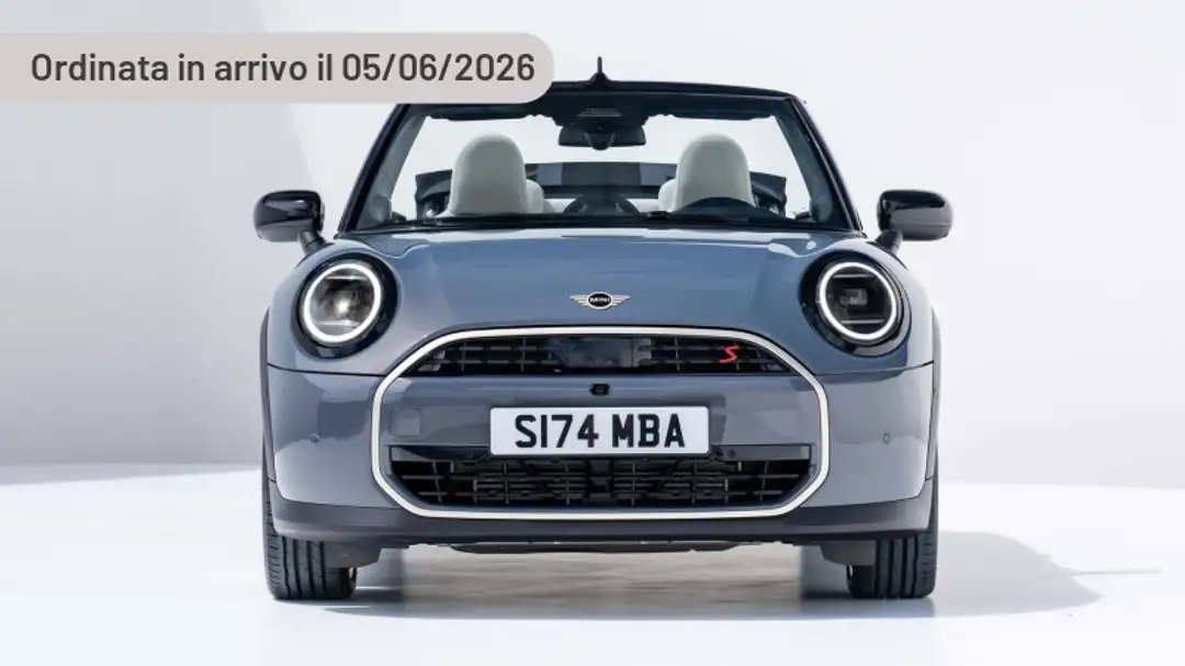 Retrovisori esterni neri, Soft Top nero, Interni in Ecopelle Nightshade Blue, Chiusura centralizzata, Correttore assetto fari, Sedile guida regolabile in altezza, Vetri elettrici anteriori, Servosterzo, Indicatore temperatura esterna, Controllo automatico velocità, Autoradio, Frenata automatica di emergenza, Indicatore di pressione pneumatici, Sedili standard, Sedili sportivi JCW, Climatizzatore automatico bizona, Specchietti retrovisori esterni di colore nero, Riconoscimento pedone, Radio digitale DAB, TeleServices, Legal Emergency Call, Griglia anteriore con cornice nera, Crash sensor (sblocco automatico chiusura portiere in caso di incidente), Volante con corona riscaldabile, Airbag laterali per la testa per prima e seconda fila di sedili, Assistente di attenzione alla guida, Attacchi Isofix per il sedile anteriore del passeggero, Controllo dinamico di stabilità DSC con funzioni estese, Cruise Control con funzione frenante, Doppia presa USB type C (charging/data) nel bracciolo porta oggetti anteriore, Driving Assistant, Fari a LED, Kit di riparazione pneumatici, MINI Interaction Unit, Park Distance Control, Parking Assistant, PC iBrake (PostCrash Collision Warning with braking function), Porta bevande nella console centrale, Presa 12V nella console centrale, Sensori pioggia, Sistema anti bloccaggio di sicurezza ABS, con Brake Assist System e Cornering Brake Control, Specchietti retrovisori esterni regolabili elettricamente e riscaldati, Tergicristalli con ugelli lavavetro integrati, Triangolo di emergenza, Volante sportivo, Interni in Ecopelle Beige, Volante in pelle artificiale regolabile in altezza e in profondità, Alette parasole anteriori con specchietto di cortesia, Smartphone Integration (Apple CarPlay e Android Auto), Pacchetto luci interne, Airbag frontali e laterali per guidatore e passeggero anteriore, Badge con nome modello su portellone posteriore, Bulloni antifurto, Cinture di sicurez
