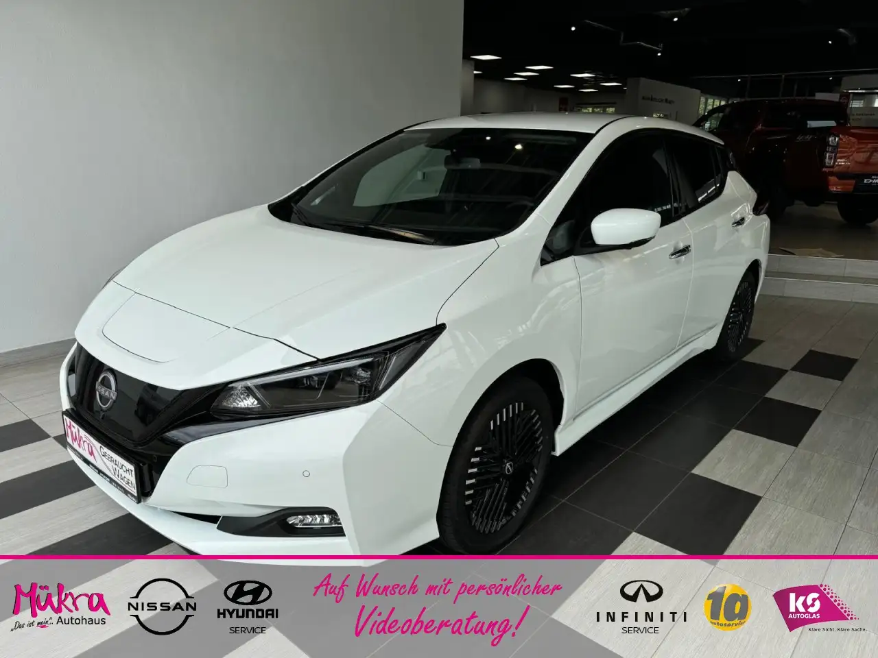 Sitze Stoff Schwarz mit blauen Nähten, Sitzbezug / Polsterung: S, LED Scheinwerfer, Tagfahrlicht LED, Fahrassistenz-System: Fernlichtassistent, Airbag Fahrerseite, Seitenairbag, Kopf-Airbag-System, Klimaautomatik, Anti-Blockier-System (ABS), ESP, Traktionskontrolle, Touchscreen-Farbdisplay (8.0 Zoll) in Mi, Einparkhilfe vorn, Zentralverriegelung mit Fernbedienung, Schließ-/Startsystem intelligent key, Fensterheber elektrisch vorn + hinten, Servolenkung elektronisch gesteuert, Audiosystem: Radio mit MP3-Wiedergabefun, Soundsystem, USB-Schnittstelle, Abstandsregeltempomat, Fahrassistenz-System: Berganfahr-Assiste, Wegfahrsperre (elektronisch), Scheibenwischer mit Regensensor, Ambiente-Beleuchtung, Spurhalteassistent, Fahrassistenz-System: Totwinkel-Assisten, Notbremsassistent, Müdigkeitserkennung, Außentemperaturanzeige, LM-Felgen, Anhängekupplung Abnehmbar 13-Polig, Fahrer-Informations-System (FIS) mit Far, Smartphone Schnittstelle (Apple CarPlay, Airbag Beifahrerseite, Außenspiegel elektr. verstellbar, Außenspiegel heizbar, Außenspiegel elektr. anklappbar, Innenspiegel mit Abblendautomatik, Audiobedienung am Lenkrad, Lenkrad heizbar, Lenkrad (Leder), Gepäckraumabtrennung, Automatikgetriebe, Wärmeschutzverglasung mit UV-Schutz, Rücksitz geteilt/klappbar, Freisprecheinrichtung, Bluetooth-Schnittstelle, Reifendruck-Kontrollsystem, Winter Paket, Isofix-Aufnahmen für Kindersitz, Leuchtweitenregelung elektrisch, Rückfahrkamera, Wärmepumpe zur Reichweitenoptimierung, Außenfarbe Arctic Solid White, Around View Monitor (360 Umgebungsansic, Ausstattungs-Paket: Nissan Connect EV, Fahrassistenz-System: Autonomer Notbrems, Fahrassistenz-System: Verkehrszeichenerk, Pro Pilot-Paket, Scheinwerfer LED, Winter-Paket, 6 Lautsprecher, Akustischer Umfeldschutz (Außensound), Audio-/Radio-Fernbedienung am Lenkrad, Autom. Begleitfunktion der Beleuchtung (, Automatische Fahrlichtschaltung, Außenspiegel Wagenfarbe, B-Säulen schwarz, Blinkleuchte in Außenspiegel integriert, Bremsassistent (Nissan Brake-Assist), Elektr. Bremskraftverteilung (EBD), Elektromotor 160 kW (cont. 90 kW), Fahrassistenz-System: Autom. Distanzrege, Fahrassistenz-System: Autonomer Lenk-Ass, Fahrassistenz-System: Geschwindigkeits-W, Fahrassistenz-System: Müdigkeitserkennun, Fahrassistenz-System: Querverkehrs-Assis, Fahrassistenz-System: Spurwechselassiste, Fahrassistenz-System: aktiver Spurhaltea, Frontkamera, Geschwindigkeits-Regelanlage (Tempomat), Getriebe für Elektrofahrzeug, Getränkehalter hinten, Getränkehalter in Mittelkonsole, Getränkehalter vorn, Gurtstraffer, HV-Batterie 62 kWh, Handschuhfach beleuchtet, Heckleuchten LED, Innenraumfilter: Pollenfilter, Kamerasystem Around View, Kofferraumabdeckung, Ladekabel mit Schukostecker (Mode 2), Ladekabel mit Typ 2-Stecker (Mode 3), Ladevorrichtung Wechselstrom (bis 6.6 kW, Lenksäule (Lenkrad) höhenverstellbar, Parkbremse elektrisch, Pedalerie elektr. einstellbar, Schnellladevorrichtung, Sitz vorn links höhenverstellbar, Start-Stop-Knopf, Steckdose (12V-Anschluß) in Mittelkonsol, Türgriffe außen verchromt, Uni-Lackierung, Verglasung hinten abgedunkelt, Starterpaket ohne Berechnung