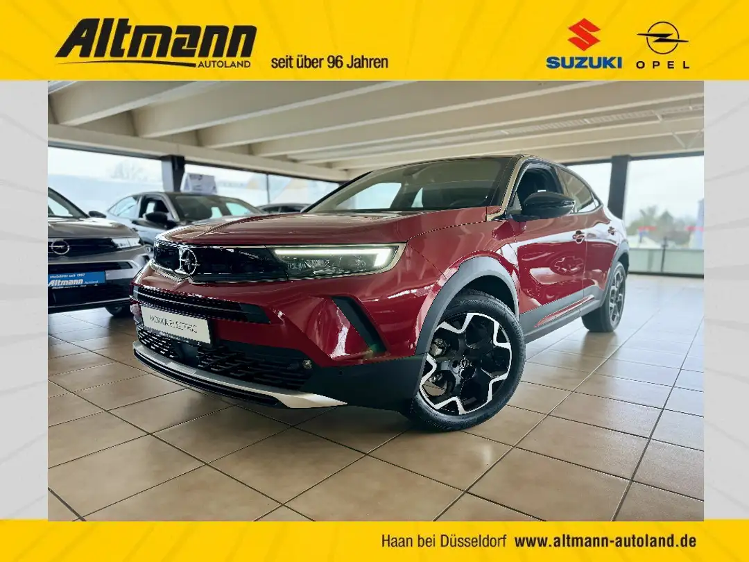 • 6 Lautsprecher* Akustischer Fußgängerschutz (Außensound)* Anti-Blockier-System (ABS)* Antriebsart: Frontantrieb* Audiosystem Multimedia Radio PRO* Außenspiegel elektr. verstell- und heizbar, elektr. anklappbar* Bluetooth Audio-Streaming* DAB-Tuner (Radioempfang digital)* Dach Diamant-Schwarz* Dachhimmel schwarz* Dachspoiler* Elektrofahrzeug* Elektromotor 100 kW (cont. 57 kW)* Elektron. Stabilitäts-Programm Plus (ESP)* Fahrassistenz-Paket: Active Drive Assist* Fahrassistenz-Paket: Active Drive Assist plus* Fahrassistenz-System: Fernlichtassistent* Fahrassistenz-System: Müdigkeitserkennungs-Sensor* Fahrassistenz-System: Totwinkel-Assistent* Fahrassistenz-System: Verkehrszeichenerkennung* Feststellbremse elektrisch* Freisprecheinrichtung (Bluetooth) mit Sprachsteuerung* Gepäck-/Laderaumboden doppelt* Getriebe für Elektrofahrzeug* Heckleuchten LED* Innenausstattung: Leder Alcantara* Karosserie: 5-türig* Klimaautomatik* Kopf-Airbag-System* Kühlergrill, Opel Vizor, Rahmen in Chrom* LM-Felgen 7x18 (5-Y-Speichen, Bicolor)* Ladekabel mit Schukostecker (Mode 2)* Ladevorrichtung On-Board-Lader (11 kW)* Lenkrad heizbar* MP3-Schnittstelle für Mobiltelefon/Handy* Nebelscheinwerfer LED* Opel Connect* Parkpilotsystem hinten* Radstand 2561 mm* Reifen-Reparaturkit* Rückfahrkamera mit 180° Umgebungsansicht* Scheibenwischer mit Regensensor* Schließ-/Startsystem Keyless Open* Seitenairbag vorn* Sicht-Paket* Tagfahrlicht LED* Technologie-Paket Park & Go* Wärmepumpe zur Reichweitenoptimierung* Wärmeschutzverglasung* Wärmeschutzverglasung hinten abgedunkelt (Solar-Protect)* Audio-Navigationssystem Multimedia Navi Pro (10* Dach Kontrast-Lackierung* Metallic-/Mineraleffekt-Lackierung* Sitzheizung vorn* Voll-LED (IntelliLux)* Winter-Paket* Dach Kontrast-Lackierung