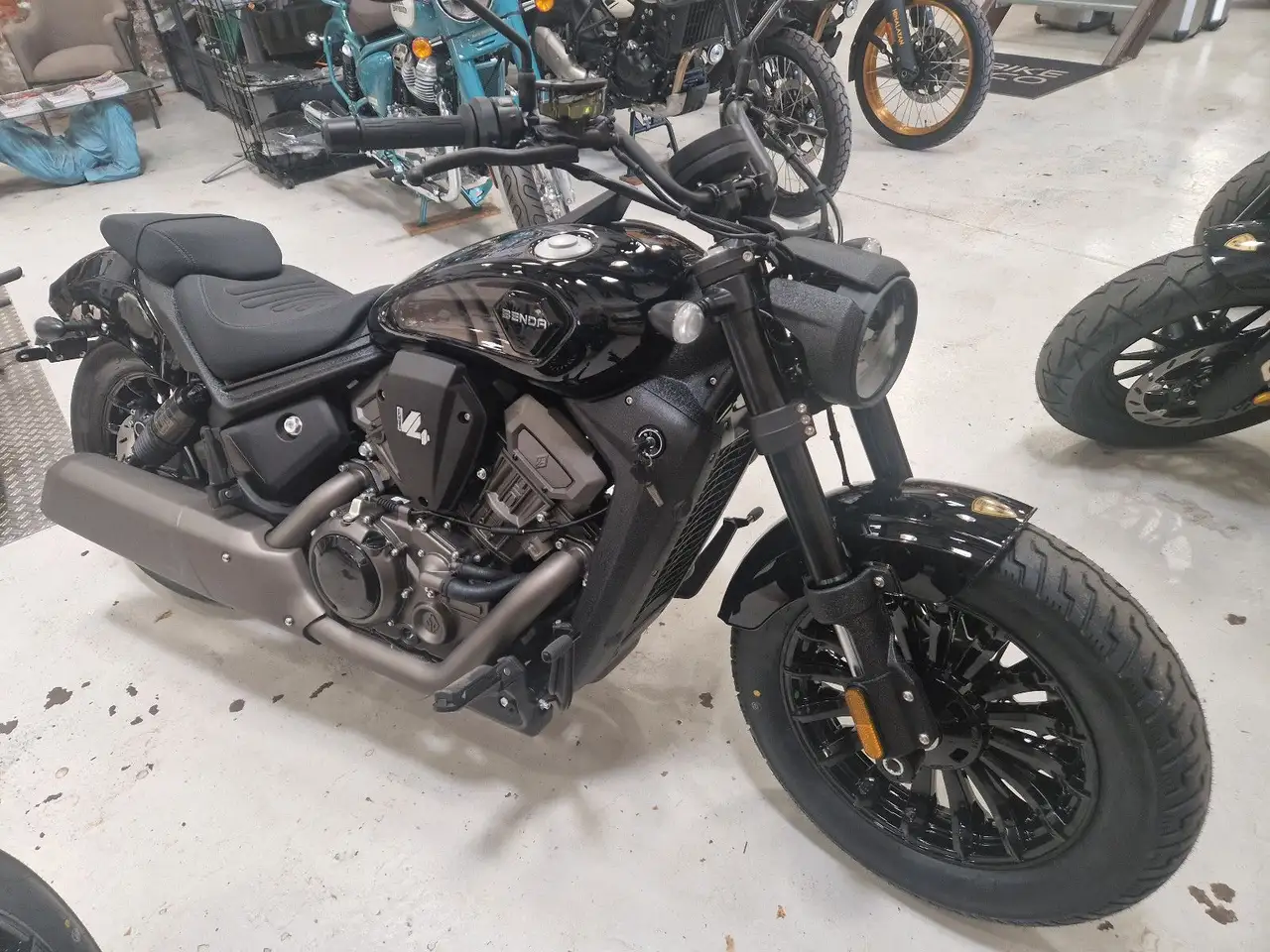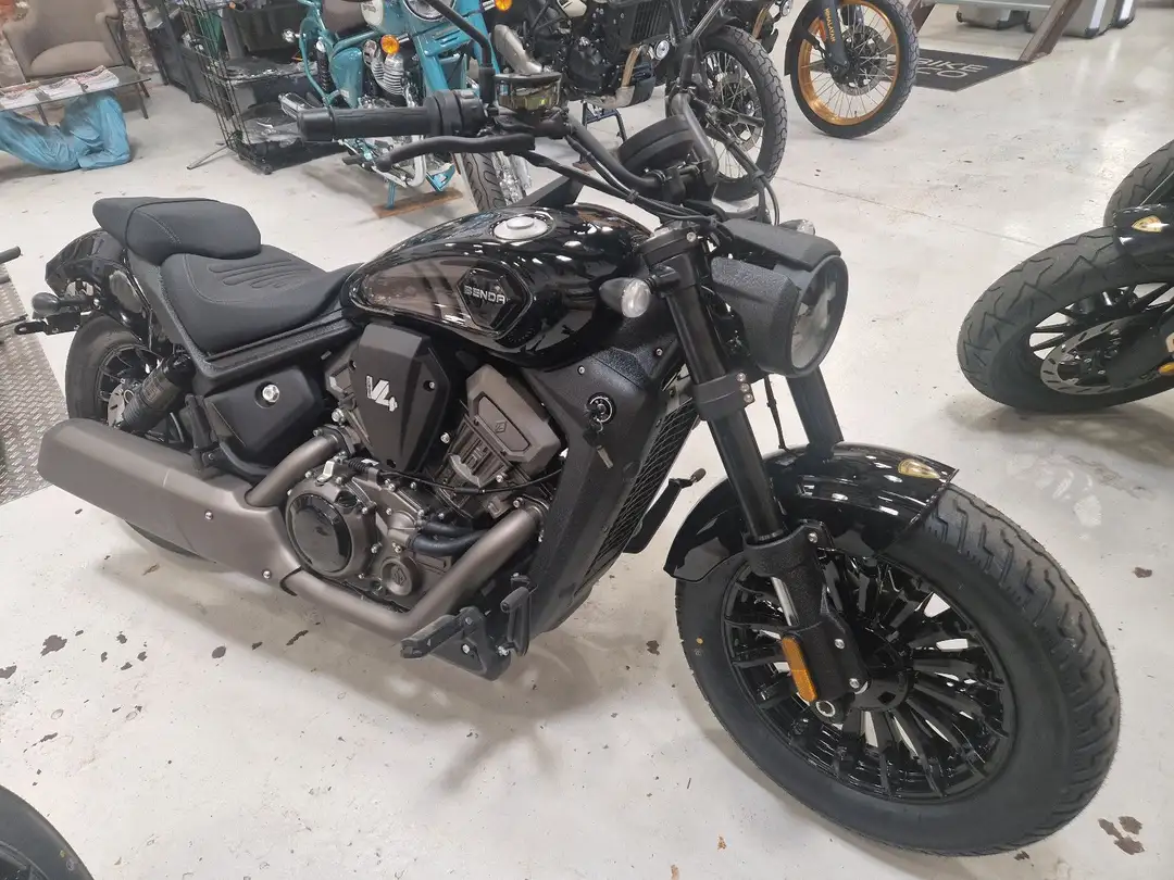 Benda baut ein Motorrad in der 500er-Klasse mit V4. Der Geist zeichnet einen Supersportler der guten alten Zeit nach, doch die Darkflag 500 ist ein Cruiser mit V4 und 54 PS. Klassisch gezeichnet, mit modernen Elementen und – wichtig – Zahnriemen als Antrieb. Neben dem im Grunde schon immer exotischen Motorenlayout des V4 fällt bei der kleinen Benda das einzigartiger Luftfahrwerk auf. Und das ist immer noch nicht das Auffälligste an der neuen Benda Dark Flag 500!