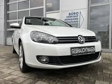 Volkswagen Golf 6 Cabrio 2.0 TDI 103kW/140PS "Life" m. 6-Gang Schaltgetriebe, Gebrauchtfahrzeug (DE-Ausführung) aus 2. Hand (Erstbesitz Volkswagen AG) m. 2-Zonen Klimaautomatik "Climatronic", Sitzheizung für Vordersitze, Tempomat, Mittelarmlehne vorne in Stoff m. Staufach, 3-Speichen Multif.-lederlenkrad, Bordcomputer m. Multifunktionsanzeige, Radio/Navigationssystem "RNS 310 / RNS 315" m. Touchscreen Farbdisplay, CD-Fach,MEDIAin Anschluss Mittelarmlehne, 12V Anschluss Mittelkonsole, klimatiesirtes Handschuhfach, Müdigkeitserkennung, Innenspiegel autom. abbl., 4x el. Fensterheber, el. verstell-/beheiz-/anklappbare Außenspiegel, Komfortsitze vorne in Stoff m. Sitzhöhenverstellung u. Lordosenstütze, Licht-/Regensensor, Dachhimmel schwarz, geteilt umklappbare Rückbank, ISOFIX, Rückbankfernentreieglung, 12V Anschluss Kofferraum, Einparkhilfe (PDC) vorne u. hinten, Rückfahrkamera, Tagfahrlicht, Nebelscheinwerfer, 17" Leichtmetallräder, ZV m. Fernbedienung.