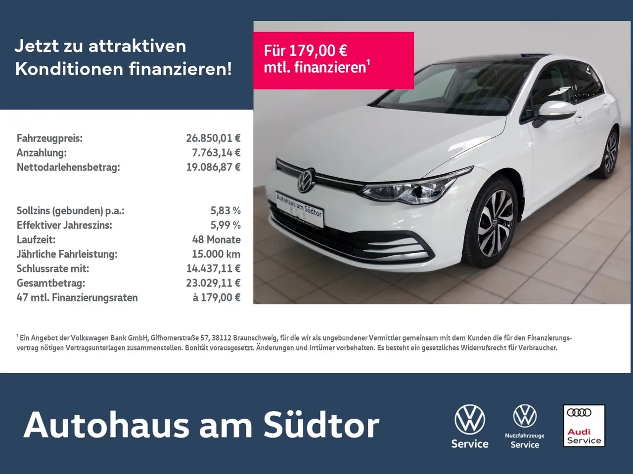 - Unter Raten verstehen wir den indikativen monatlichen Betrag bezogen auf das ausgeschriebene Finanzierungsbeispiel. Wir empfehlen dem Verbraucher, die Anzeige sorgfältig zu lesen. Der Verbraucher kann verschiedene Zahlungs- und/oder Finanzierungsformen bewerten, indem er den Werbetreibenden oder andere Finanzinstitute kontaktiert.