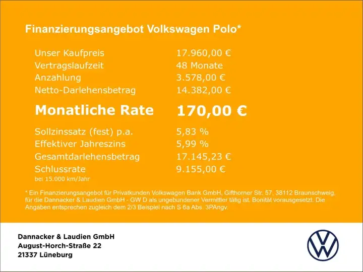 - Unter Raten verstehen wir den indikativen monatlichen Betrag bezogen auf das ausgeschriebene Finanzierungsbeispiel. Wir empfehlen dem Verbraucher, die Anzeige sorgfältig zu lesen. Der Verbraucher kann verschiedene Zahlungs- und/oder Finanzierungsformen bewerten, indem er den Werbetreibenden oder andere Finanzinstitute kontaktiert.