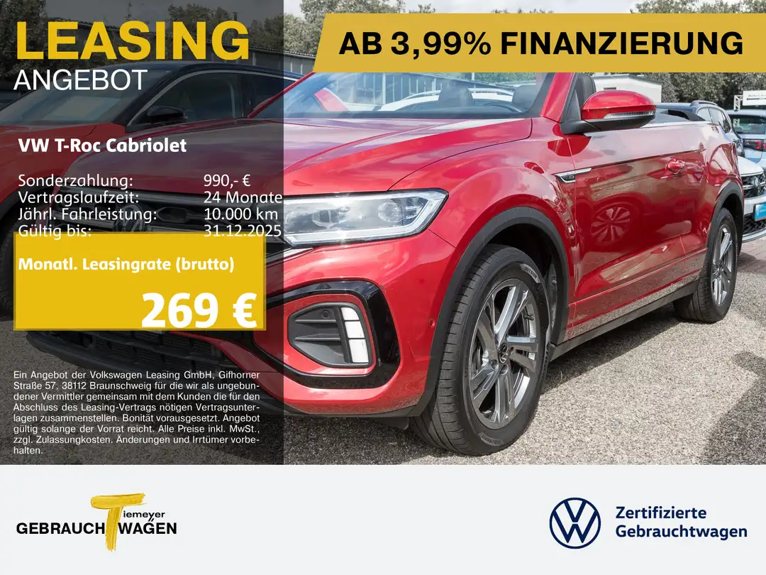 Ausstattungsvariante, R-Line, Garantie, Anschlussgarantie 3 Jahre max. 100.000 km, Getriebe / Antrieb, Automatik, Frontantrieb, Pakete, Winter Paket, Airbags, Fahrer-/Beifahrerairbag, Kopfairbag, Seitenairbag, Sicherheit, IQ. Light - LED-Matrix-Scheinwerfer, Abbiegelicht, LED Tagfahrlicht mit Leaving und Coming Home Funktion, Schlechtwetterlicht, Spurhalteassistent Lane Assist, Antiblockiersystem ABS, Antischlupfregelung ASR, Auto Hold Funktion, Beifahrerairbag Deaktivierung, Diebstahlwarnanlage mit Innenraumüberwachung und Abschleppschutz, Dynamische Fernlichtregulierung Dynamic Light Assist, dynamisches Blinklicht, Einparkhilfe vorn und hinten mit Parklenkassistent, Elektrisches Stabilitätsprogramm ESP, Fahrlichtautomatik, Fußgängererkennung, Gegenlenkunterstützung - Vehicle Stability Management VSM, Geschwindigkeitsbegrenzer, Gespannstabilisierung, ISOFIX Kindersitzbefestigung, Lichtsensor, Motor-Schleppmoment-Regelung MSR, Müdigkeitserkennung, Notruf Service, Progressivlenkung, Regensensor, Reifendruckkontrolle, Rückfahrkamera Rear View, Umfeldbeobachtungssystem Front Assist, Verkehrszeichenerkennung, Audio & Kommunikation, Discover Pro mit TFT-Farbtouchscreen, Navigationssystem, Handy / Telefon Freisprecheinrichtung Comfort mit induktiver Ladefunktion, Sprachsteuerung, Streaming & Internet, 2 USB-C-Ladebuchsen an der Mittelkonsole hinten, 2 USB-C-Schnittstellen vorn, 6 Lautsprecher, Android Auto, App-Connect Wireless, Apple CarPlay, Digitaler Radioempfang DAB+, Online-Connectivity-Unit, VW Connect Plus Vorbereitung, VW Connect Vorbereitung, We Connect Plus Vorbereitung, We Connect Vorbereitung, Komfort, Fahrer-/Beifahrersitz höhenverstellbar, Fahrprofilauswahl, Lendenwirbelstütze Fahrer-/Beifahrersitz elektrisch, Sitzheizung, Sport-Komfortsitze, Standheizung/-lüftung programmierbar mit Fernbedienung, Air Care Climatronic 2-Zonen, Automatische Distanzregelung ACC, Easy Entry, Fensterheber elektrisch, Keyless Entry - Keyless Access Schlüsselloses Schließ und Startsystem, Mittelarmlehne vorn, Servotronic, Windschott, Zentralverriegelung mit Fernbedienung, Ablagefach vorn, Interieur, Sitzbezüge in Stoff / Alcantara, Digital Cockpit Pro, Ambientebeleuchtung, Make-up Spiegel beleuchtet, Multifunktionslederlenkrad beheizbar mit Schaltwippen, Pedale in Edelstahl gebürstet, Rücksitzlehne geteilt/klappbar, Exterieur, Anhängerkupplung abnehmbar und abschließbar, Sportfahrwerk, Außenspiegel elektrisch verstell-/anklappbar beheizt mit Memory, Außenspiegel mit Umfeldbeleuchtung, Elektronische Differentialsperre EDS, LED Rückleuchten, Leichtmetallfelgen 17 Zoll Valencia, Leiste zwischen den Scheinwerfern beleuchtet, Rekuperation - Bremsenergierückgewinnung, Start-Stop System, Umfeldbeleuchtung mit Logoprojektion, Verdeck elektrisch, Leuchtweitenregulierung automatisch dynamisch, Sonstiges, 12 Volt Steckdose vorne, ECO-Funktion, Pannenkit, Scheibenwaschdüsen beheizbar, Waschwasser-Standanzeige, Metallic-Lackierung, ., Einstiegsleisten vorn mit "R-Line"-Schriftzug