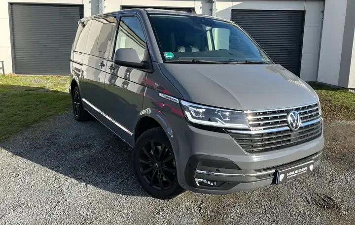 Airbag Beifahrer abschaltbar, Airbag Fahrer-/Beifahrerseite, Antriebs-Schlupfregelung (ASR), Antriebsart: Allradantrieb, Anzeige für Waschwasserstand, Armaturentafel Komfort, Ausstattungs-Paket Licht + Sicht, Außenspiegel elektr. verstell-, heiz- und anklappbar, Außenspiegel konvex, links, Außenspiegel konvex, rechts, Außenspiegel und Türgriffe außen in Wagenfarbe, Bodenbelag im Fahrerhaus: Velours-Vlies, Bordwerkzeug, Chrom-Paket, Chromleisten Stoßfänger vorn, seitlich und Heckklappe unten, Dachverkleidung Himmel Komfort mit Luftausströmer, Deaktivierungsschalter für Antriebs-Schlupfregelung (ASR), Dämmglas-Paket, Fahrassistenz-System: Autom. Distanzregelung (ACC) und Umfeldbeobachtungssystem (Front Assist, bis 210 km/h), Fahrassistenz-System: Bremsassistent (HBA), Fahrassistenz-System: Einparkhilfe vorn und hinten, Fahrassistenz-System: Fernlichtregulierung (Light Assist), Fahrassistenz-System: Multikollisionsbremse (Multi Collision Brake), Fahrassistenz-System: Seitenwind-Assistent, Fahrassistenz-System: Spurwechselassistent (Side Assist / Blind Spot Sensor), Fahrassistenz-System: Verkehrszeichenerkennung, Fahrwerk 17", Frontscheibe Dämmglas, Funkschlüssel (2) klappbar, Fußmatten Fahrerhaus: Velours, Haltegriffe A-Säulen, Handschuhfach abschließbar, Handschuhfach beleuchtet, Heckklappe mit Verglasung, Heckscheibe heizbar, mit Wischanlage, Innenausstattung: Dekoreinlagen Pewter Wave Grey, Innenleuchten im Fahrerhaus: Leseleuchten vorn (2), Innenleuchten im Lade-/FG-Raum LED, Umfeldleuchte in Heckklappe, Innenleuchten im Lade-/FG-Raum: Trittstufenleuchten, Innenraumfilter: Pollenfilter, Innenspiegel mit Abblendautomatik, Karosserie/Aufbau: Bus, Karosserievariante: Normaldach, Klimaautomatik Climatronic (Fahrerhaus + Lade-/Fahrgastraum), Kraftstofftank: 70 Ltr., Kühlergrill schwarz lackiert, mit Chromleisten, Ladekanten-/ Trittstufenabdeckungen in Edelstahl, Lenksäule (Lenkrad) verstellbar, Mobile Online Dienste App-Connect Wired und Wireless, Mobile Online Dienste We Connect Plus, Mobiltelefon Schnittstelle Bluetooth, Motor 2,0 Ltr. - 150 kW TDI, Multimedia-Schnittstelle 2 x USB (Typ C) vorn und 2 x USB-Ladeanschluß an C-Säule, Notrufsystem, Radioempfang digital (DAB+), Radstand 3000 mm, Reifen-Reparaturkit, Reifenkontroll-Anzeige, Schadstoffarm nach Abgasnorm Euro 6d, Scheinwerfer und Heckleuchten LED, Schiebetür Lade-/Fahrgastraum rechts, Seitenairbag / Kopfairbag (Curtain-Airbag) vorn, Seitenscheiben Dämmglas, Servolenkung elektro-mechanisch, Sitzbezug / Polsterung: ArtVelours / Kunstleder, Sitze im Fahrerhaus: Fahrer- und Beifahrersitz heizbar, Sitze im Fahrerhaus: Fahrer- und Beifahrersitz höhenverstellbar, Sitze im Fahrerhaus: Fahrersitz Komfort, Sitze im Fahrerhaus: Lendenwirbelstützen Fahrer- und Beifahrersitz, Sitze im Lade-/FG-Raum: 1.Reihe, 2 Drehsitze, Sitze im Lade-/FG-Raum: 2.Reihe, 3er-Sitzbank, Sonnenblenden mit Spiegel (beleuchtet), Sonnenschutzrollo im Fahrgastraum, Sprachsteuerungs-System, Start/Stop-Anlage Motor, Steckdosen (12V-Anschluß) im Fahrerhaus (2 Stück), Steckdosen (12V-Anschluß) im Lade-/Fahrgastraum (2 Stück), Stoßfänger in Wagenfarbe, Verglasung hinten abgedunkelt, Verkleidung im Lade-/FG-Raum: Komfort, Verzurrösen Laderaum, Warnanlage für Sicherheitsgurte (Fahrer-/Beifahrerseite), Zentralverriegelung mit Fernbedienung und Innenbetätigung, Zuheizer, Zul. Gesamtgewicht 3,08 t.
