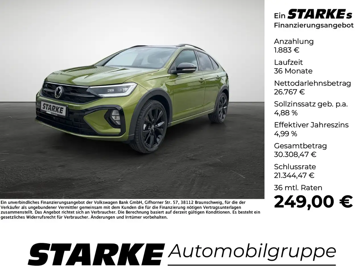 - Unter Raten verstehen wir den indikativen monatlichen Betrag bezogen auf das ausgeschriebene Finanzierungsbeispiel. Wir empfehlen dem Verbraucher, die Anzeige sorgfältig zu lesen. Der Verbraucher kann verschiedene Zahlungs- und/oder Finanzierungsformen bewerten, indem er den Werbetreibenden oder andere Finanzinstitute kontaktiert.