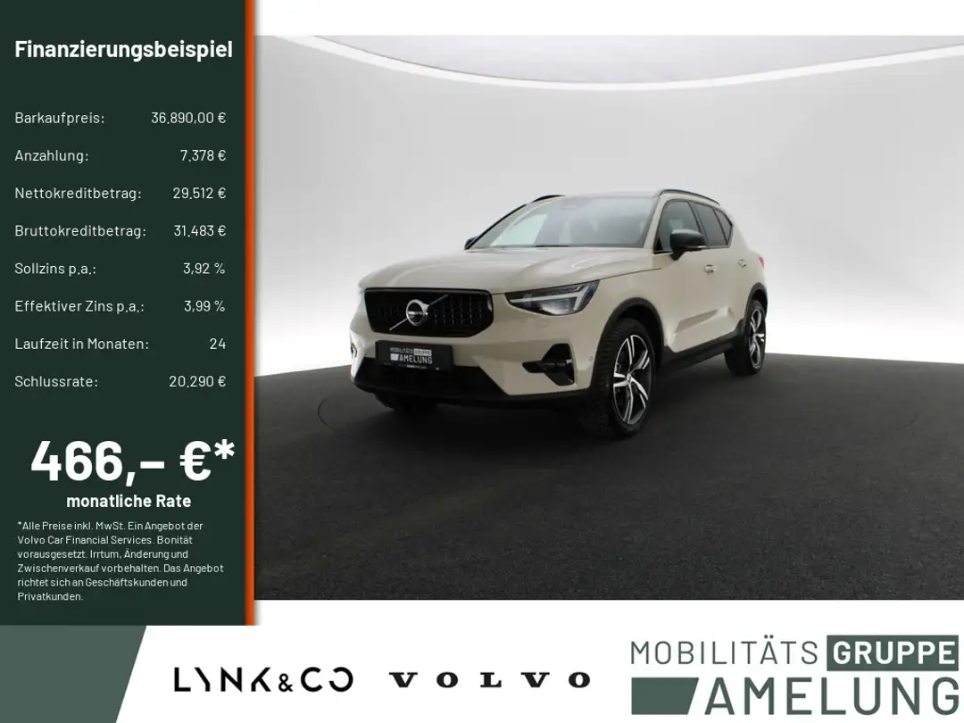 *Ein Aktions Zielfinanzierung-Finanzierungsbeispiel der Volvo Car Financial Services, Santander-Platz 1, 41061 Mönchengladbach für Privatkunden und Geschäftskunden: 466,41 EUR monatl. Rate, 3,99 Prozent eff. Jahreszins bei 24 Monaten Laufzeit, einer Anzahlung von 7.378,00 EUR, einer jährlichen Laufleistung von 10.000 km und einer Schlussrate von 20.289,50 EUR. (Sollzins gebunden p.a. 3,92 Prozent, Gebühren 0,00 EUR, Kosten für Ratenabsicherung 0,00 EUR, Bruttokreditbetrag: 31.483,40 EUR, Nettokreditbetrag: 29.512,00 EUR)