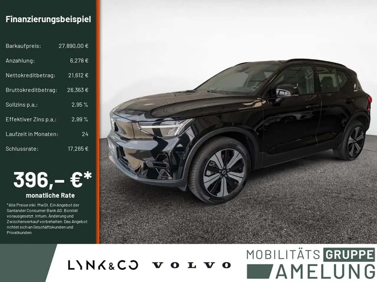 *Ein Sonderprogramm SB-Finanzierungsbeispiel der Santander Consumer Bank AG, Santander Platz 1, 41061 Mönchengladbach für Privatkunden und Geschäftskunden: 395,58 EUR monatl. Rate, 2,99 Prozent eff. Jahreszins bei 24 Monaten Laufzeit, einer Anzahlung von 6.278,00 EUR und einer Schlussrate von 17.264,50 EUR. (Sollzins gebunden p.a. 2,95 Prozent, Gebühren 0,00 EUR, Bruttokreditbetrag: 26.362,87 EUR, Nettokreditbetrag: 21.612,00 EUR)