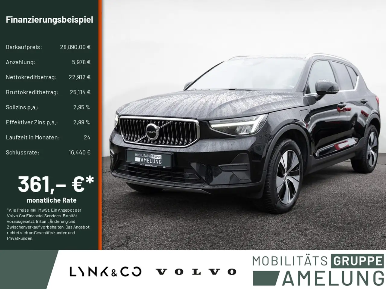*Ein Aktions Zielfinanzierung-Finanzierungsbeispiel der Volvo Car Financial Services, Santander-Platz 1, 41061 Mönchengladbach für Privatkunden und Geschäftskunden: 361,42 EUR monatl. Rate, 2,99 Prozent eff. Jahreszins bei 24 Monaten Laufzeit, einer Anzahlung von 5.978,00 EUR, einer jährlichen Laufleistung von 10.000 km und einer Schlussrate von 16.439,50 EUR. (Sollzins gebunden p.a. 2,95 Prozent, Gebühren 0,00 EUR, Kosten für Ratenabsicherung 0,00 EUR, Bruttokreditbetrag: 25.113,63 EUR, Nettokreditbetrag: 22.912,00 EUR)