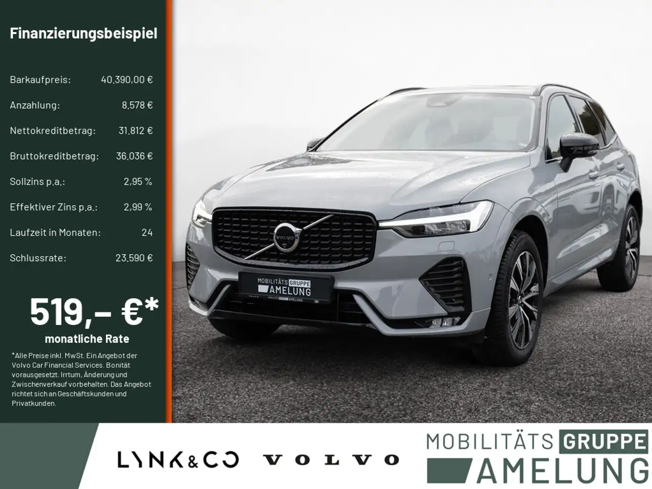 *Ein Aktions Zielfinanzierung-Finanzierungsbeispiel der Volvo Car Financial Services, Santander-Platz 1, 41061 Mönchengladbach für Privatkunden und Geschäftskunden: 518,61 EUR monatl. Rate, 2,99 Prozent eff. Jahreszins bei 24 Monaten Laufzeit, einer Anzahlung von 8.578,00 EUR, einer jährlichen Laufleistung von 10.000 km und einer Schlussrate von 23.589,50 EUR. (Sollzins gebunden p.a. 2,95 Prozent, Gebühren 0,00 EUR, Kosten für Ratenabsicherung 0,00 EUR, Bruttokreditbetrag: 36.036,25 EUR, Nettokreditbetrag: 31.812,00 EUR)