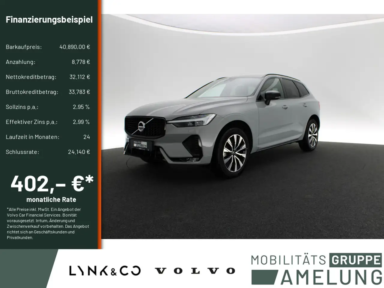 *Ein Aktions Zielfinanzierung-Finanzierungsbeispiel der Volvo Car Financial Services, Santander-Platz 1, 41061 Mönchengladbach für Privatkunden und Geschäftskunden: 401,83 EUR monatl. Rate, 2,99 Prozent eff. Jahreszins bei 24 Monaten Laufzeit, einer Anzahlung von 8.778,00 EUR, einer jährlichen Laufleistung von 10.000 km und einer Schlussrate von 24.139,50 EUR. (Sollzins gebunden p.a. 2,95 Prozent, Gebühren 0,00 EUR, Kosten für Ratenabsicherung 0,00 EUR, Bruttokreditbetrag: 33.783,41 EUR, Nettokreditbetrag: 32.112,00 EUR)