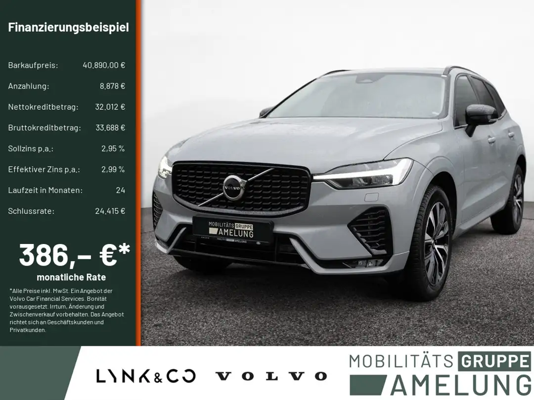 *Ein Aktions Zielfinanzierung-Finanzierungsbeispiel der Volvo Car Financial Services, Santander-Platz 1, 41061 Mönchengladbach für Privatkunden und Geschäftskunden: 386,40 EUR monatl. Rate, 2,99 Prozent eff. Jahreszins bei 24 Monaten Laufzeit, einer Anzahlung von 8.878,00 EUR, einer jährlichen Laufleistung von 10.000 km und einer Schlussrate von 24.414,50 EUR. (Sollzins gebunden p.a. 2,95 Prozent, Gebühren 0,00 EUR, Kosten für Ratenabsicherung 0,00 EUR, Bruttokreditbetrag: 33.688,00 EUR, Nettokreditbetrag: 32.012,00 EUR)