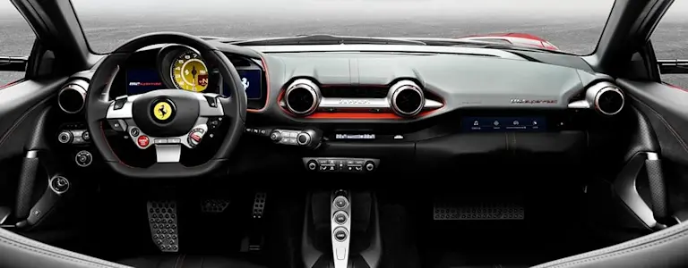 - Im Innenraum gefällt der Ferrari 812 Superfast mit einer überraschend umfangreichen Ausstattung. Bequeme Sportsitze, moderne Technik und sogar ein Soundsystem stehen zur Verfügung.
