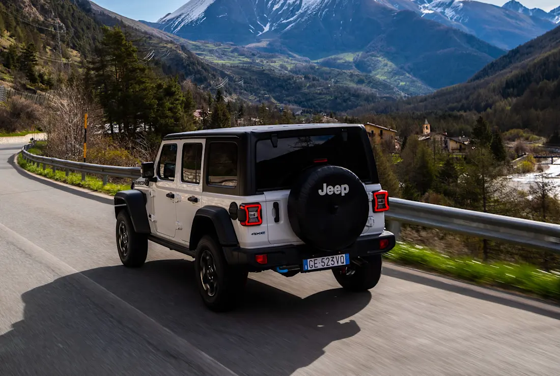 Das Allradantriebssystem kann zur Verbesserung des Kraftstoffverbrauchs in den Zweiradantriebsmodus umgeschaltet werden. Der Jeep Wrangler 4xe hat eine rein elektrische Reichweite von bis zu 60 Kilometern und eine Höchstgeschwindigkeit von 156 km/h.