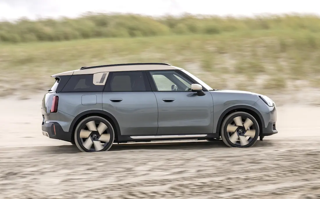 In der Seitenansicht machen sich neu konzeptionierte Türgriffe bemerkbar, das abgesenkte Dach verleiht dem Countryman 2024 Dynamik. An der C-Säule befindet sich ein charakteristischer Knick, außerdem prangt dort eine Art "Bühne", um unterschiedliche Modelle und Ausstattungsvarianten der Mini-Neuheit zu definieren.