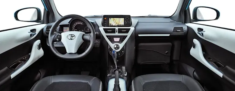 Der Innenraum des Toyota iQ wird von einer dreieckigen Mittelkonsole dominiert, welche die Bedienung der serienmäßigen Klimaanlage sowie einen optionalen 5,8-Zoll-Bildschirm mit Navigationssystem aufnimmt. Ein weiteres Augenmerk ist das fehlende Handschuhfach auf der Beifahrerseite, wodurch der Beifahrersitz weiter vorn montiert werden kann.