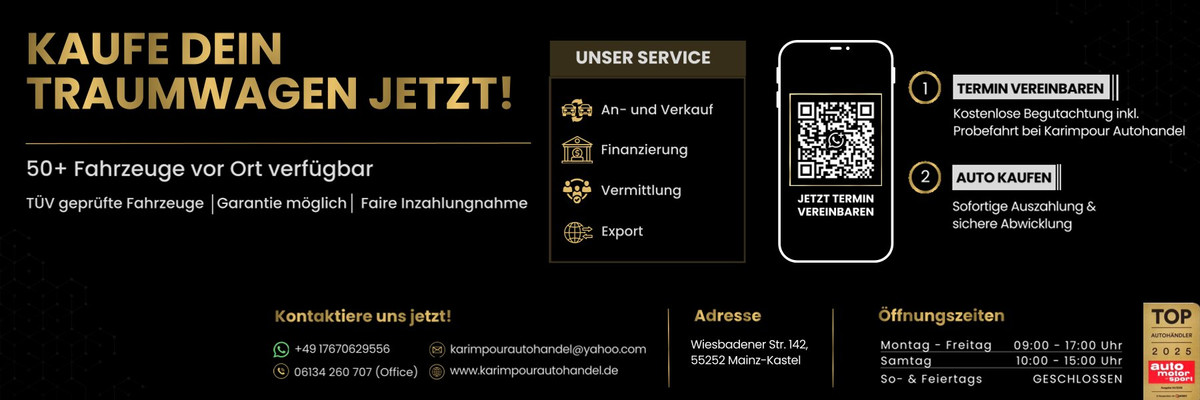 ÖffnungszeitenSeit 1986 stehen wir für Qualität, Vertrauen und exzellenten Service. Unser Autohaus bietet Ihnen eine exklusive Auswahl an geprüften Gebrauchtwagen zu fairen Preisen. Ob sportlich, luxuriös oder alltagstauglich – wir finden das perfekte Fahrzeug für Sie! ✔ Geprüfte Fahrzeuge mit Garantie ✔ Individuelle Beratung & Top-Kundenservice ✔ Attraktive Finanzierungs- & Leasingangebote ✔ Inzahlungnahme & Ankauf Ihres Gebrauchten 🏆 Unsere Qualität wurde mehrfach ausgezeichnet: ⭐ Top Händler auf Autoscout 2020, 2021, 2022, 2024 und 2025 – Unsere langjährige Expertise und unser unermüdlicher Einsatz für Kundenzufriedenheit. 🏅Platzierung unter den besten 5 Händlern auf Autoscout24 2025 – Wir gehören aktuell zu den Top 5 der besten Händler Deutschlands, basierend auf hervorragendem Kundenfeedback und exzellenter Servicequalität! 🏅Platzierung unter den Top 50 Händlern Deutschlands 2025 – Vom Auto Motor und Sport Magazin wurden wir zu den besten Autohändlern des Landes gekürt. Besuchen Sie uns in Mainz-Kastel oder entdecken Sie unser Angebot online. Wir freuen uns darauf, Sie persönlich zu beraten und Ihnen Ihr Traumauto bereitzustellen! Karimpour Autohandel – Fahren mit Vertrauen!