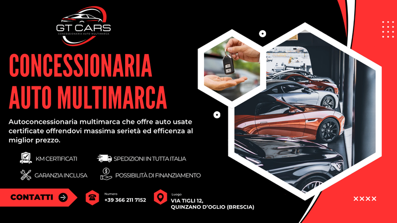 Benvenuto in GT Cars, il punto di riferimento per chi cerca auto usate multimarca garantite a Quinzano d’Oglio, tra la provincia di Brescia e Cremona. Sappiamo quanto sia importante acquistare un’auto in totale sicurezza, per questo offriamo veicoli selezionati, controllati e garantiti, con la possibilità di personalizzare ogni aspetto del tuo acquisto. I nostri servizi: 🚗 Ampia scelta di auto usate multimarca, garantite e certificate. 🔄 Valutiamo e ritiriamo il tuo usato in permuta. 💰 Soluzioni di finanziamento personalizzate per ogni esigenza. 📦 Spedizione in tutta Italia, direttamente a casa tua. 📹 Videochiamata disponibile, per vedere l’auto senza muoverti da casa. Affidati alla nostra esperienza e scegli il meglio per la tua prossima auto! Contattaci o vieni a trovarci per scoprire tutte le nostre offerte.