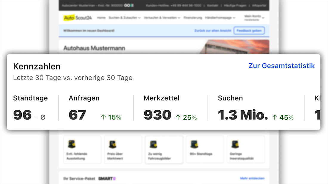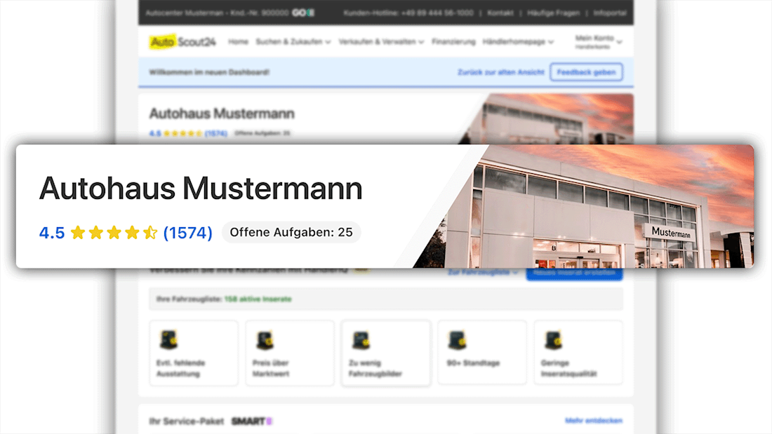 Willkommen in der neuen personalisierten Kommandozentrale Ihres AutoScout24 Händlerauftritts. Ihr vertrauter Händlerbereich wurde weiterentwickelt – zum neuen Dashboard mit modernem Look und erweiterten Funktionen für Ihren Erfolg. Erstellen Sie KI-optimierte Inserate mit HändlerIQ, behalten Sie Ihre Performance glasklar im Blick, stärken Sie das Vertrauen in Ihre Händlermarke und präsentieren Sie Ihre Fahrzeuge mit professionellen Preisschildern in Rekordzeit – direkt aus dem neuen Dashboard.
