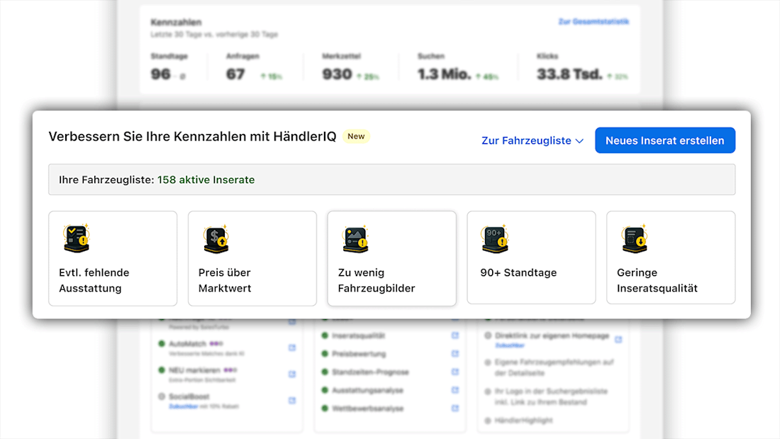 Verwandeln Sie das KI-basierte Wissen von HändlerIQ in starke Inserate – direkt von der Home Ihres neuen Dashboards aus, mit nur wenigen Klicks. Über die neuen Schnellaktionen erkennen und beheben Sie sofort Schwächen wie eine geringe Inseratsqualität, fehlende Ausstattung oder einen überhöhten Angebotspreis. Das Ergebnis: weniger Aufwand, höhere Sichtbarkeit und mehr Anfragen – ein klarer Wettbewerbsvorteil.