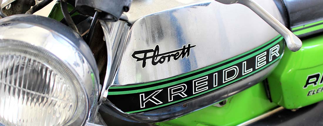 Kreidler gehört zu den großen Namen deutschen Motorradhersteller. Hervorgegangen war die Marke aus der Drahtfabrik Anton Kreidler in Stuttgart, welche ab den 1920er Jahren in die Produktion von Motorrädern einstieg, die aber noch den Namen Pan trugen. Ab 1949 begann man dann leichte und günstige Motorräder in der 50ccm Klasse zu konstruieren und diese auch unter dem Markennamen Kreidler zu vertreiben. Berühmt wurde die Marke spätestens ab 1957, als sie ihr wohl bekanntestes Modell Florett auf den Markt brachte. Die Florett war ein 50ccm Kelinkraftrad und wurde bis zum Konkurs der Firma 1982 in zahlreichen Varianten gebaut. Die üppig vorhandenen Leistungsreserven, welche für einen Betrieb mit einem Versicherungskennzeichen gedrosselt werden mussten, weckten den Ehrgeiz zahlreicher Tuner. Neben den Kleinkrafträdern baute Kreidler ab 1969 auch verschiedene Mofas. Zwischen 1969 und 1975 wurden insgesamt mehr als 150.000 Exemplare der Modelle MF2 und MF4 verkauft. Ab 1975 wurde dann die Flory bis 1977 in den Varianten MF12 und MF13 gebaut. Diese waren durch ein Zweigang Automatikgetriebe und Verbundrädern gekennzeichnet. Mit der Flory MF23 kamen dann 1977 das Topmodell dieser Baureihe auf den Markt, welches über eine Drei-Gang Handschaltung und Speichenräder verfügte. Nach dem Konkurs wurde die Flory zusammen mit dem weniger bekannten Modell Flirt bis 1985 vom italienischen Hersteller Garelli unter der Marke Kreidler weitergebaut. Insgesamt wurden von der Flory, mehr als 140.000 Stück produziert. 1980 wurde kurz vor dem Konkurs die Flott als Sport-Mofa, in den Varianten MF24 und MF25 auf den Markt gebracht. Ihr Äußeres kam entsprechend ihrer sportlichen Ambitionen einem leichten Motorrad oder Moped näher als einem Mofa. Jedoch konnte sie nicht an den Erfolg der anderen Kreidler Mofas anknüpfen. Von ihr wurden nicht einmal mehr 5000 Stück gebaut. Heute gehört die Marke Kreidler zum nordrhein-westfälischen Zweiradhersteller Prophete, welcher unter anderem Fahrräder, E-Bikes, Motorroller und Motorräder unter diesem Namen vertreibt und damit die namhafte Tradition weiterführt.